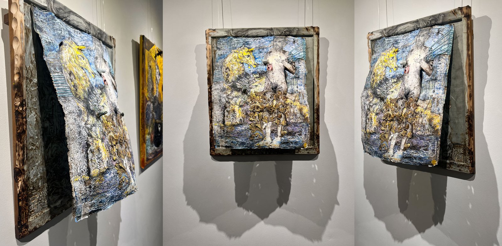 To his left, a large yellow beast materializes. It carries the body of a horse and the expression of something caught in the act of emergence. A yellow crystal is embedded in its head. The animal is dense with colour and texture where the man is pale and eroding. They appear in different states of being. The beast gathers force. The man dissolves.