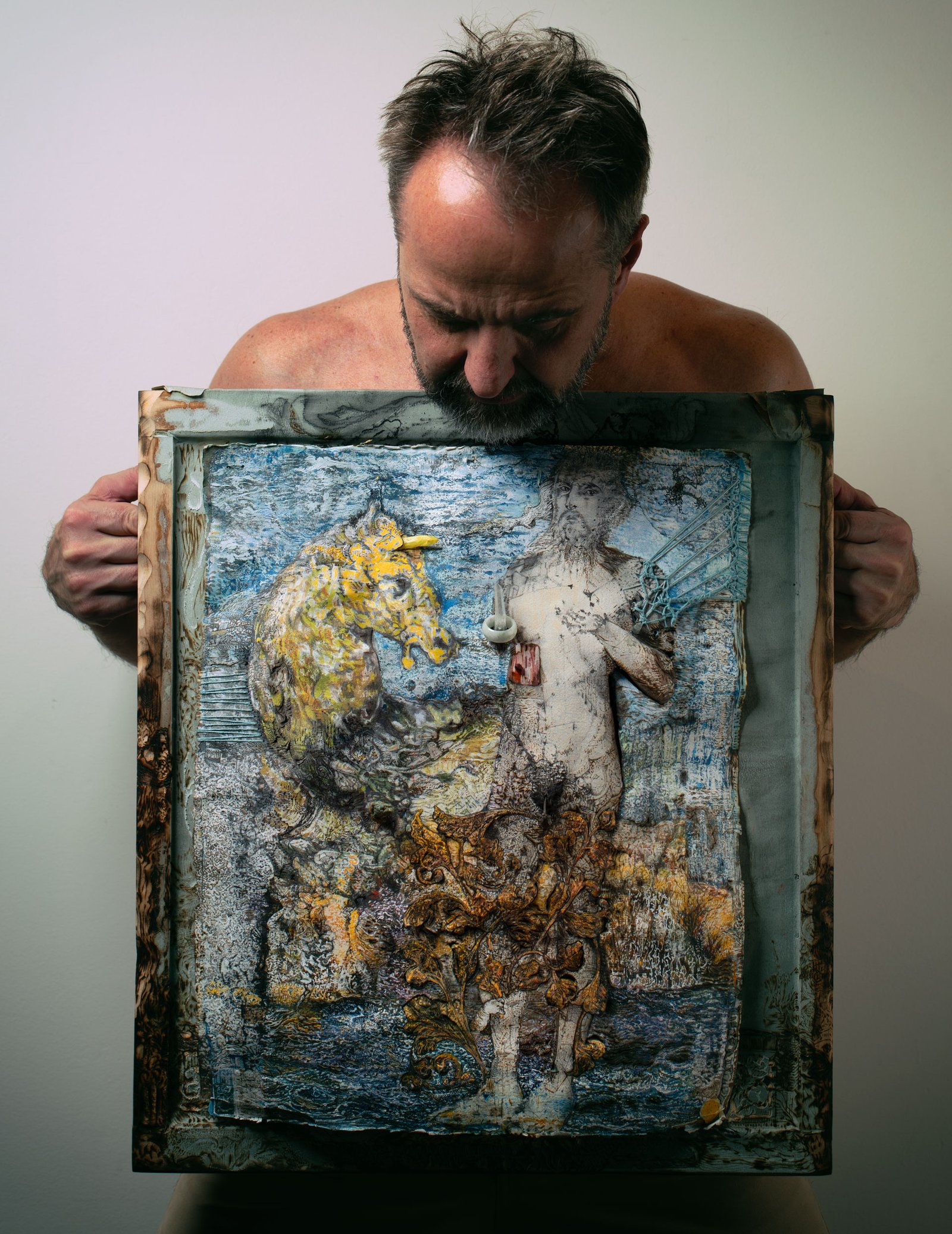 Within Milo’s larger body of work, The Disappearing Man occupies a singular place. Other works are revised, repainted, or preserved through active intervention. This one has been allowed to enter a slower and harsher condition. It has been given over to time. Years of handling, reworking, and decay have brought it to the threshold of absence. The paper turns toward dust. The figure nearly disappears. Yet the work continues to become. It moves from one image into another, dying on one side and being born on the other.