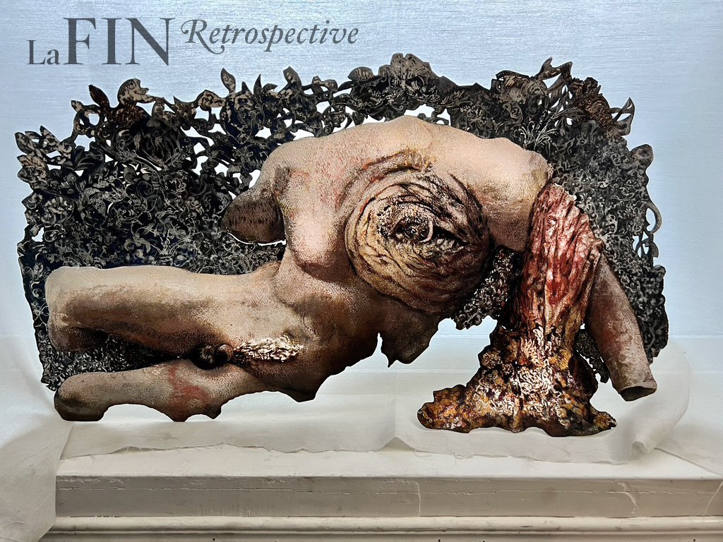 The title invokes Joseph Merrick, the historical figure whose body became spectacle and whose humanity had to be excavated from beneath deformity. Dlouhy’s Elephant Man carries the same tension. The figure is simultaneously repulsive and tender, monumental and collapsing. It asks to be looked at and resists the act of looking. The carved paper removes the safety of the rectangular frame. The work exists as a fragment, a relic pulled from some larger field of damage. Like the Parthenon fragment, the body is exposed, unguarded, surrendered to forces larger than itself.